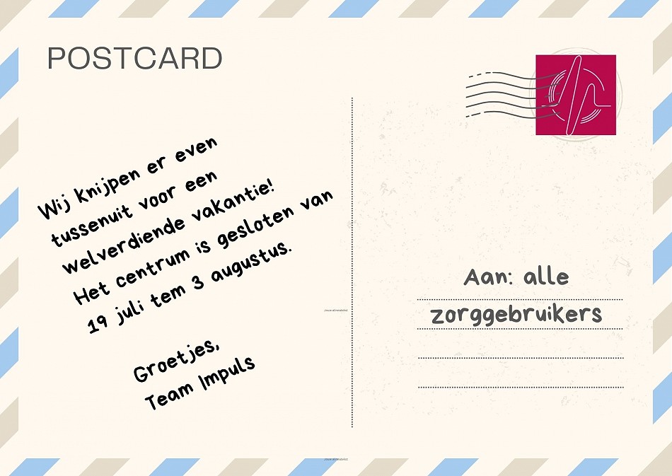 Centrum Impuls is gesloten van 20 juli 2019 tot en met 4 augustus 2019. Het centrum is terug open op 5 augustus 2019.